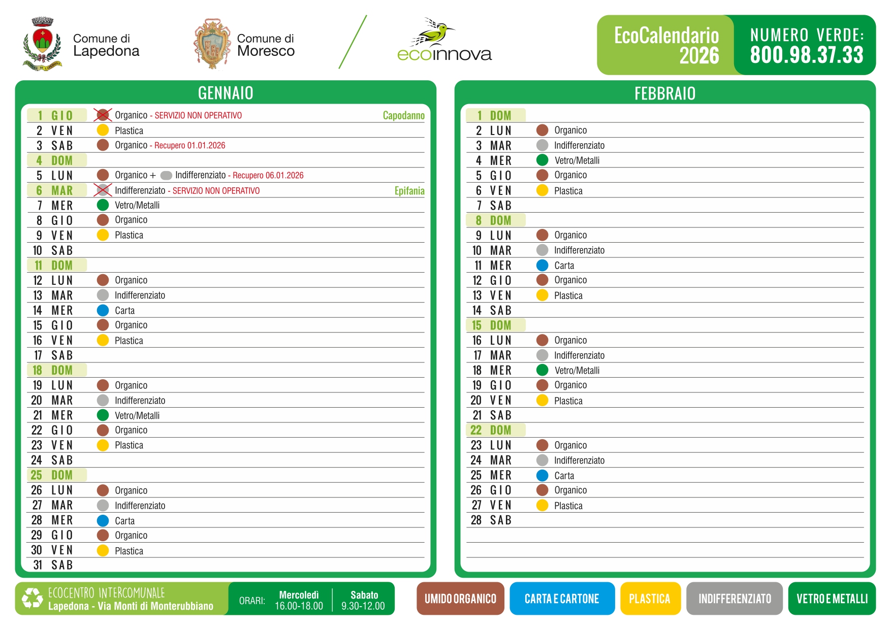 CALENDARIO RACCOLTA DIFFERENZIATA GENNAIO FEBBRAIO 2026
